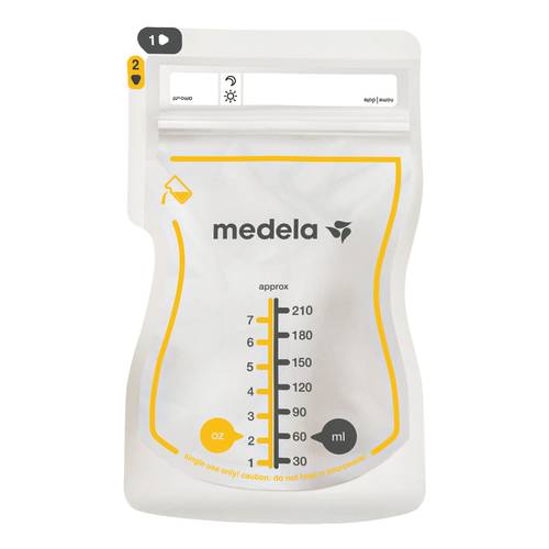 medelaEasy Pour Breast Milk Storage Bags Descrizione Sacca destinata alla conservazione, al trasporto e al riscaldamento del latte materno. Modalità d'uso Lavare le mani con acqua e sapone e asciugarle accuratamente prima di toccare la sacca. Aprire la sacca strappando la freccia 1 nella direzione indicata. Non riempire la sacca oltre la tacca che contrassegna i 210 ml, perché il latte materno aumenta di volume quando viene congelato. 2) Assicurarsi che l‘area della cerniera sia pulita, rimuovere l‘aria all‘interno della sacca e chiuderla completamente per evitare perdite. Etichettare la sacca per latte materno prima della conservaz...